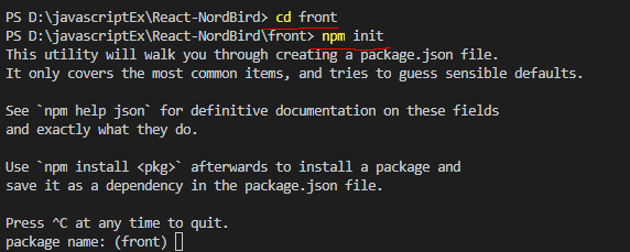 터미널에서 front 폴더로 이동합니다. 그 이후에 npm init을 선언해줍니다.