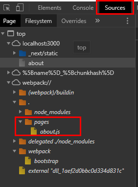 크롬 개발자 도구(F12)를 확인해보면 현재 실행중인 about.js 만 노출이 되는걸 확인할 수 있습니다.