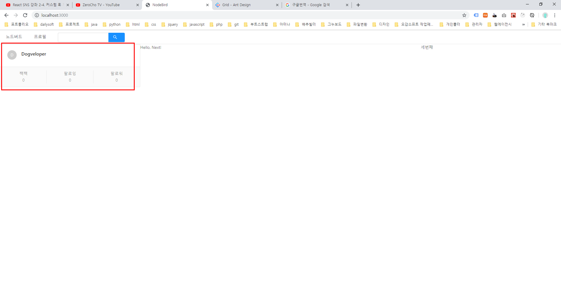 조현영(zerocho)의 JS 프로그래밍 강좌 시간 나는대로 저녁 10시 방송합니다. 컨텐츠: 무료 언어 강좌, 유료 실무 강좌(인프런에 올라감), 오픈소스 기여 방송, 책 쓰는 방송, Vue.js 사이드 프로젝트, 제로초 블로그 업그레이드하기 -- 소개 -- Node.js 교과서...