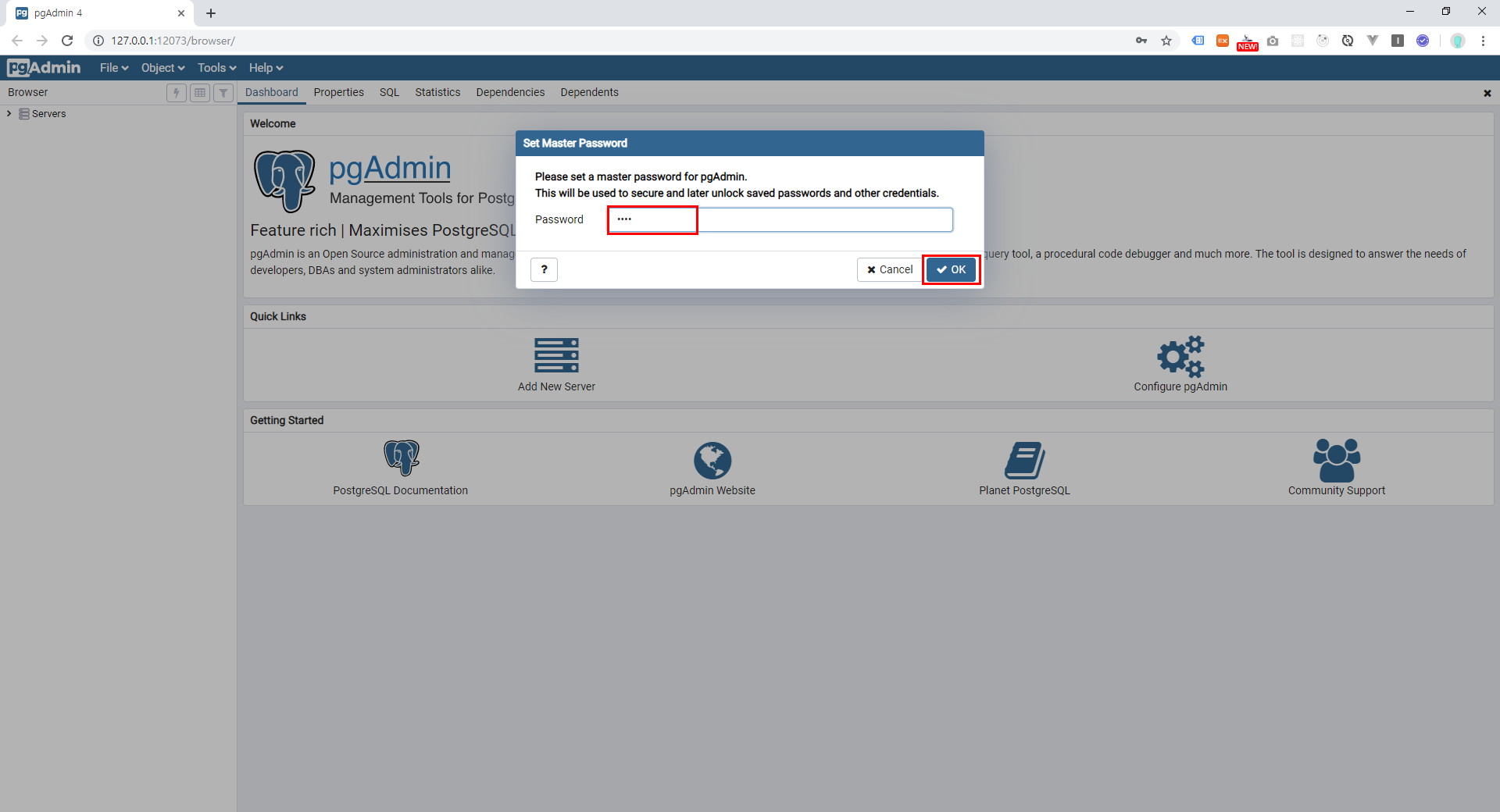 3 . 접속을 하시면 Sever Dashboard와 PostgreSQL 구조가 보입니다.