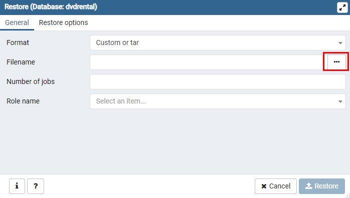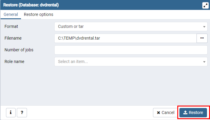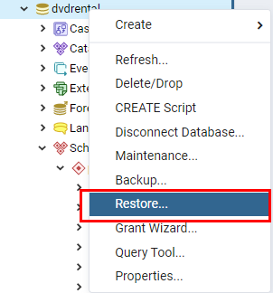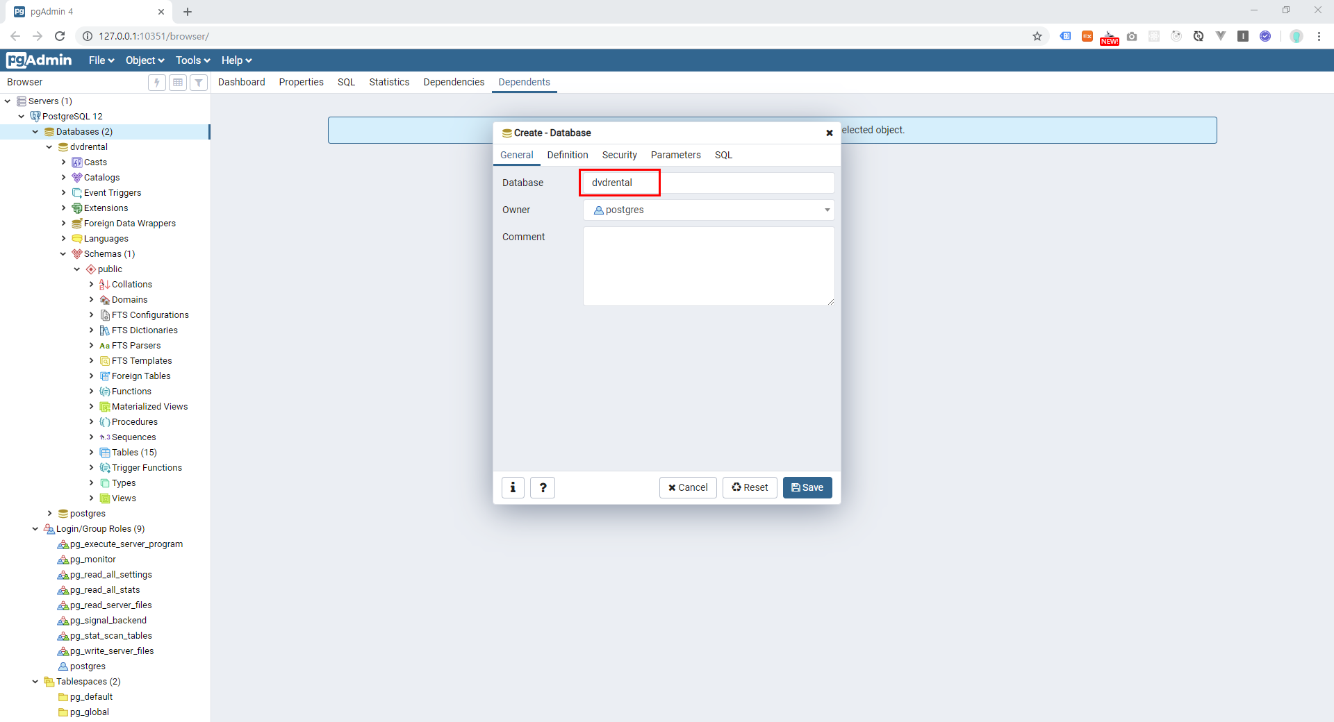 4. dvdrental 데이터베이스 이름을 입력합니다.