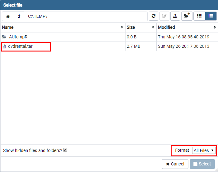 7. Format -> All Files -> C:TEMP 경로안에 dvdtental.tar 선택