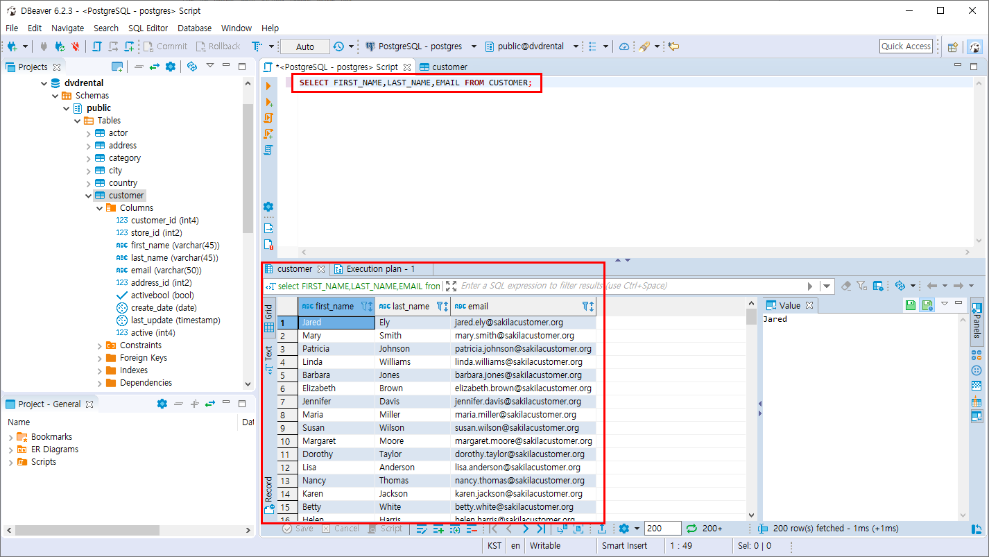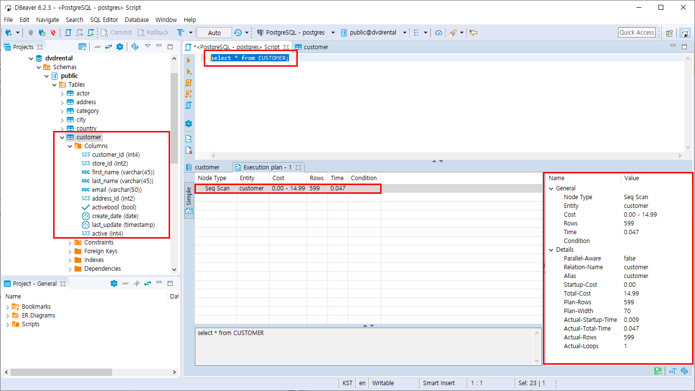 CUSTOMER TABLE을 펼치면 테이블의 속성들이 보여지며 조회된 개수,시간 등등 상세 정보도 같이 볼 수 있는 유용한 기능이 있습니다.