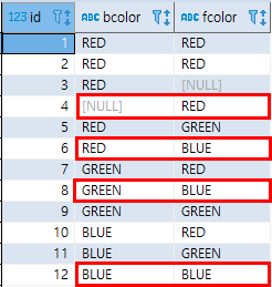 - SELECT DISTINCT를 사용하여 BCOLOR+FCOLOR 컬럼의 중복 값을 제거하여 조회하며