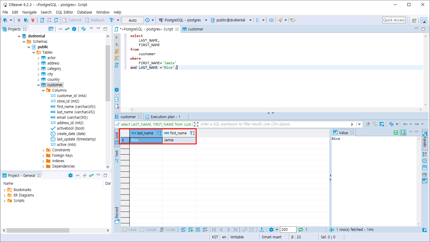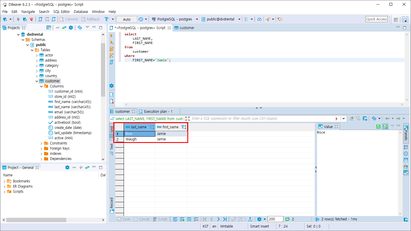 - CUSTOMER 테이블에서 FIRST_NAME 이 Jamie이고 LAST_NAME 이 Rice인 조건을 조회