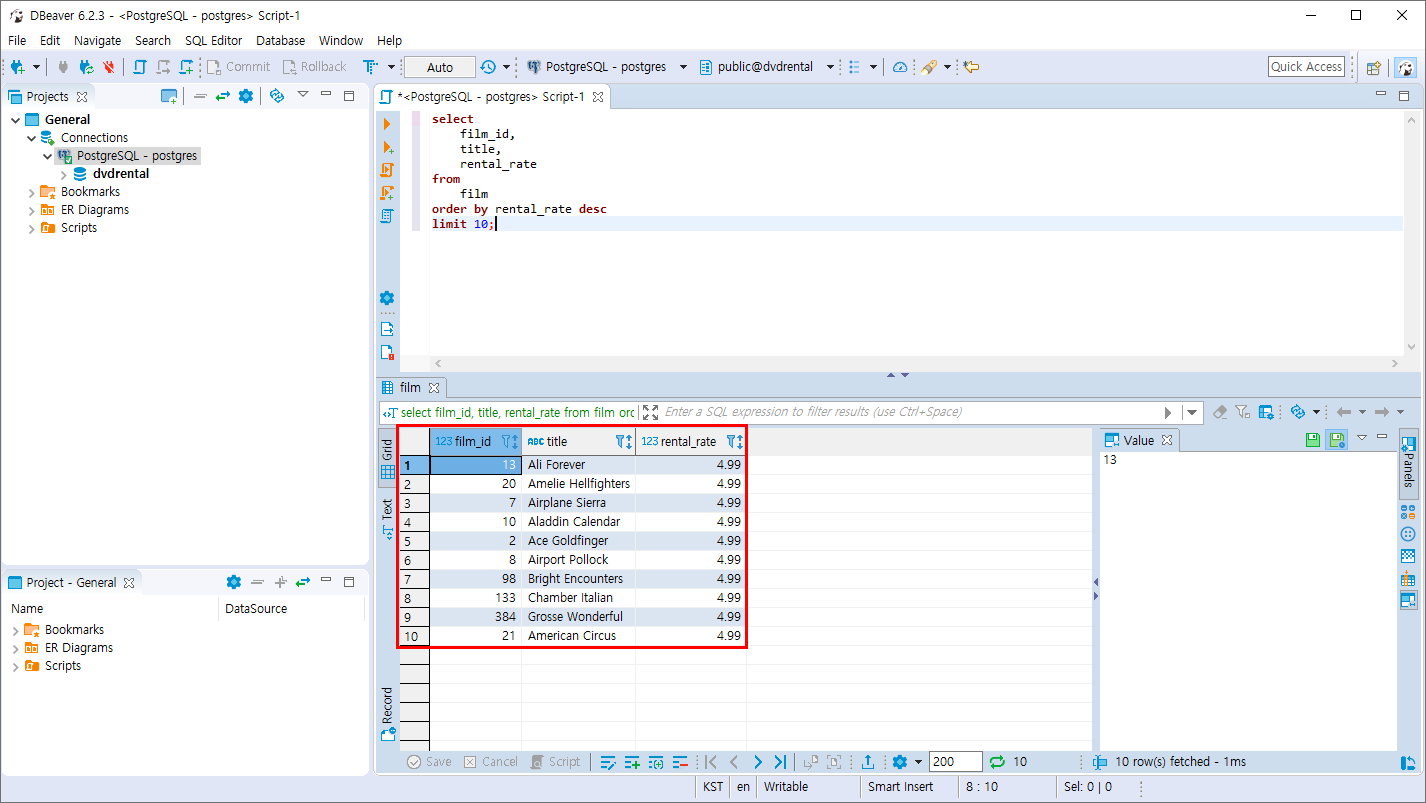 - film 테이블 데이터중 10개의 결과 값만 조회하며 rental_rate컬럼의 내림차순으로 정렬 합니다.