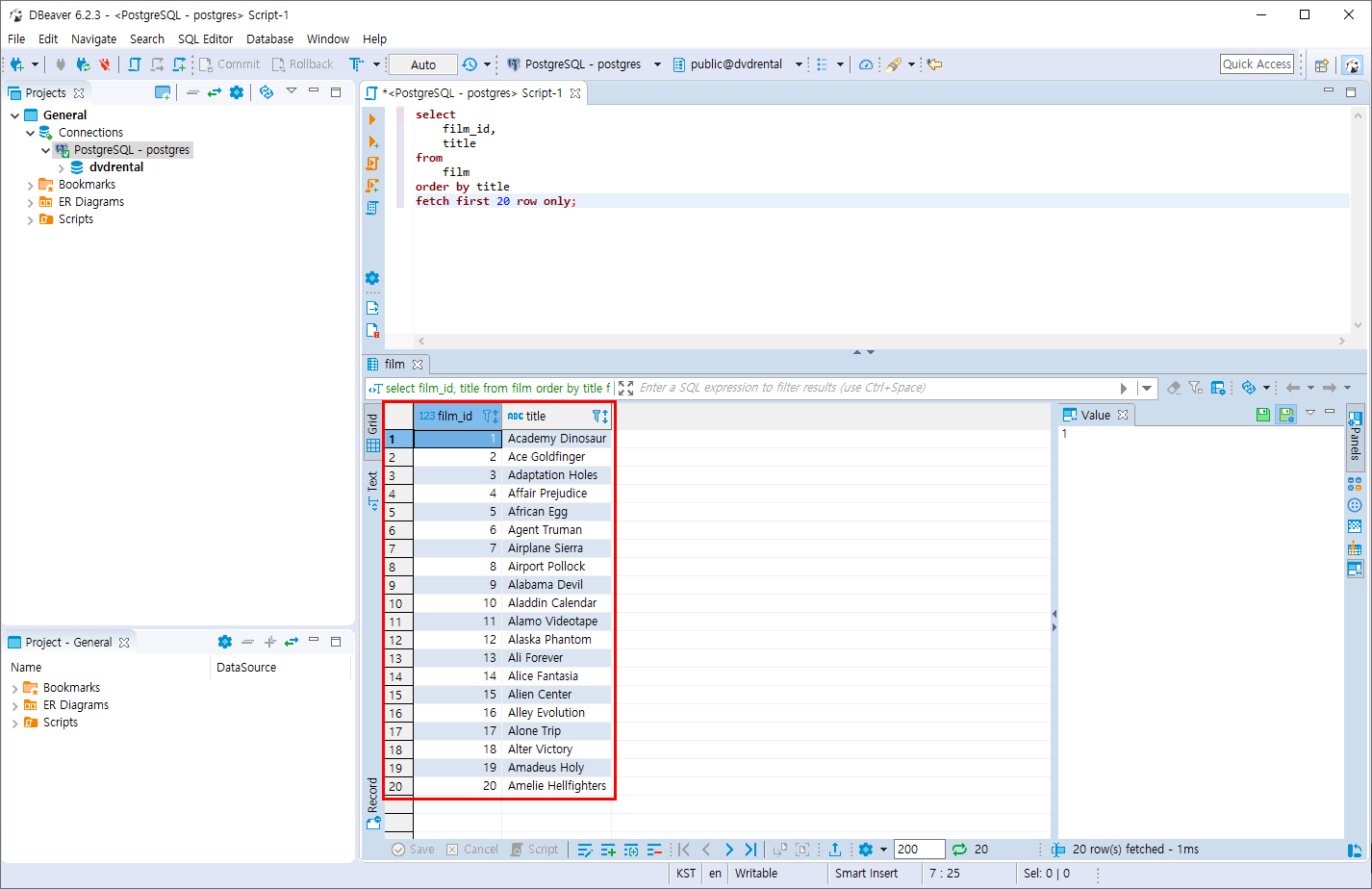 - film 테이블의 20건의 데이터를 title컬럼 기준으로 조회합니다.