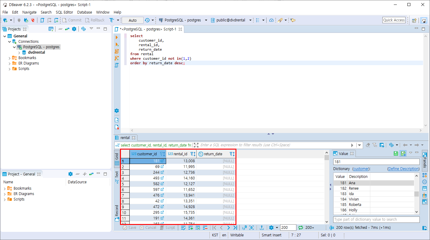 - OR연산자를 사용하여 rental 테이블의 customer_id 가 1 또는 2 인 값을 return_date 내림차순으로 정렬하여 조회합니다.