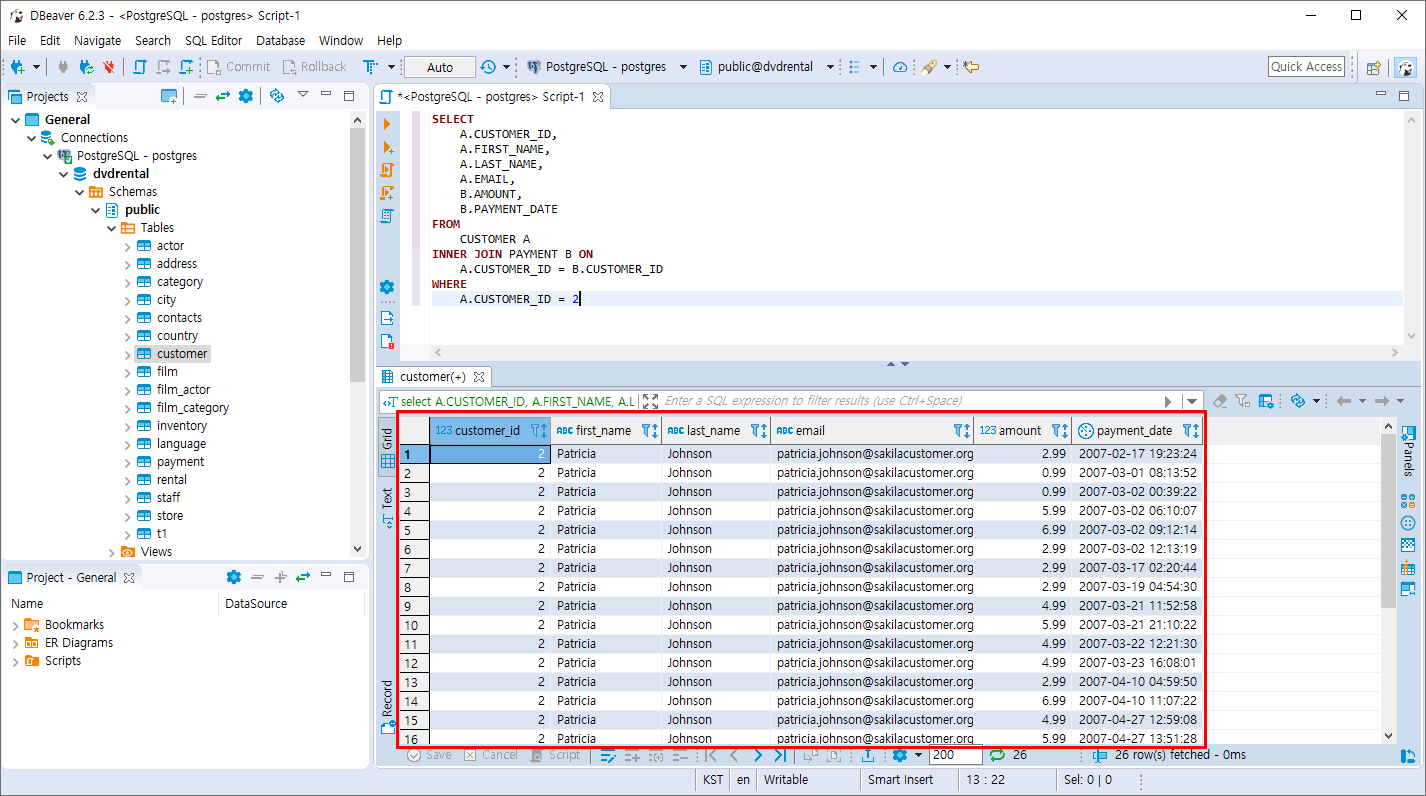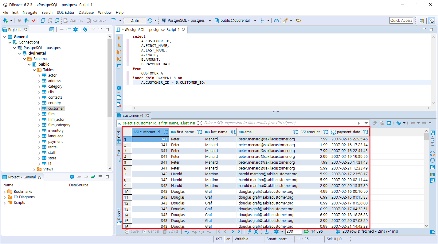 - CUSTOMER 테이블과 PAYMENT 테이블을 CUSTOMER_ID 기준으로 조인 조회를 합니다. 그리고 STAFF 테이블을 STAFF_ID 기준으로 조인 합니다.
