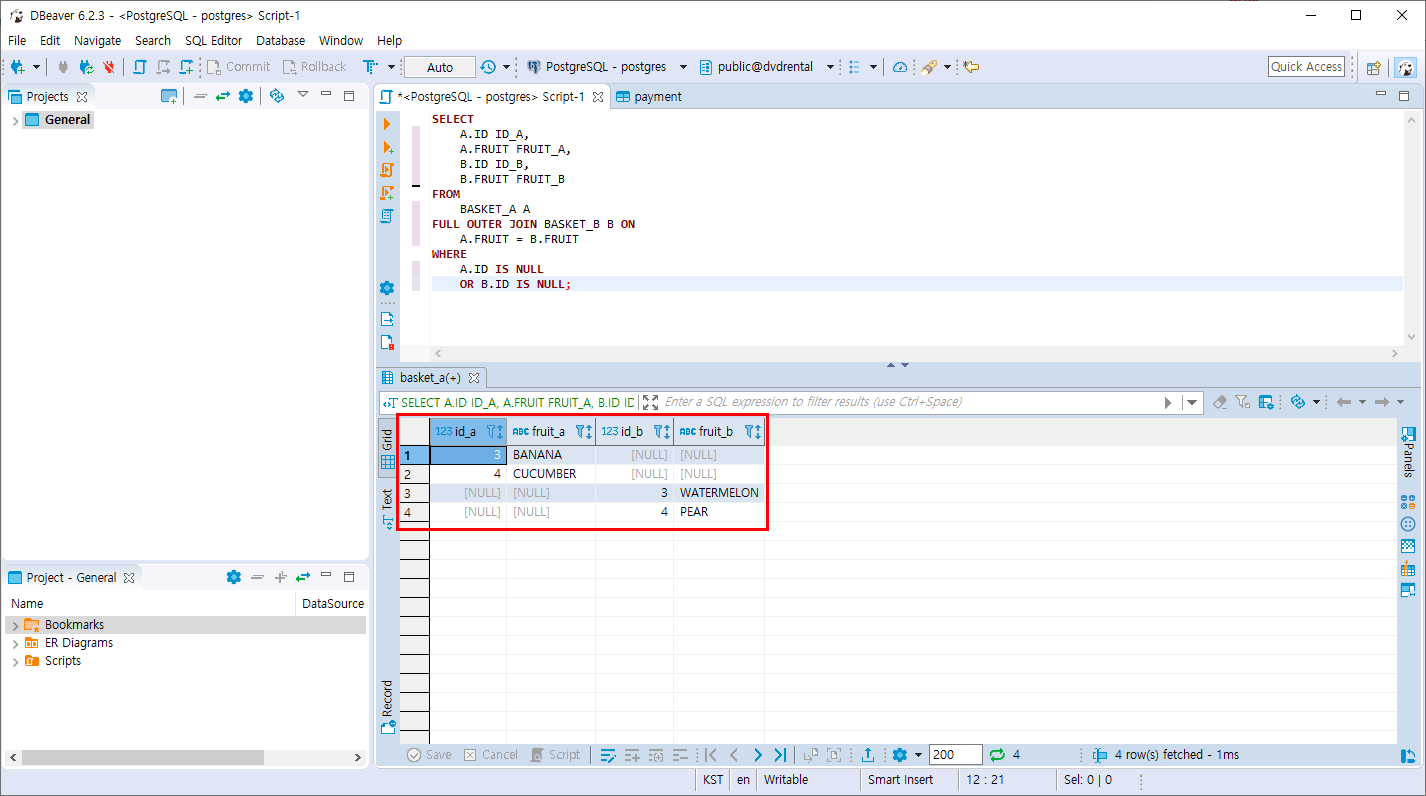 - A와 B의 테이블을 FRUIT 컬럼 기준으로 FULL OUTER 조인 합니다.