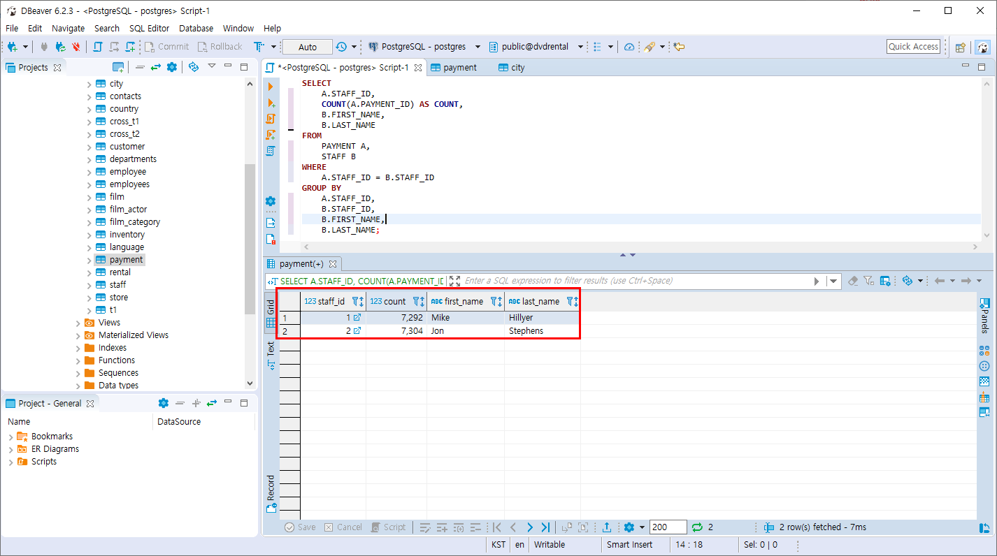 - PAYMENT 테이블을 STAFF_ID 기준으로 PAYMENT_ID의 카운트를 조회하며 STAFF_ID 기준으로 GROUP BY 합니다.