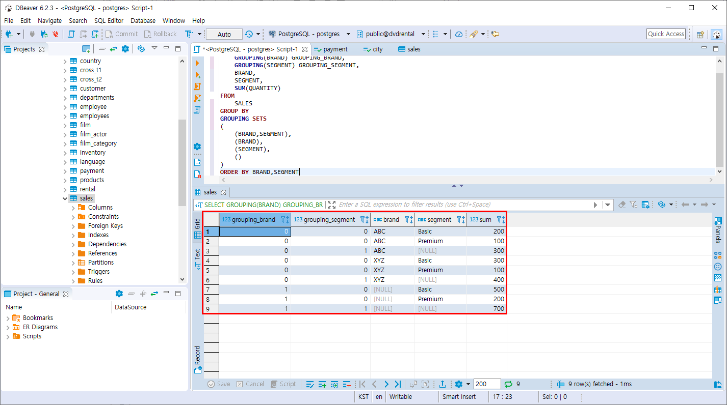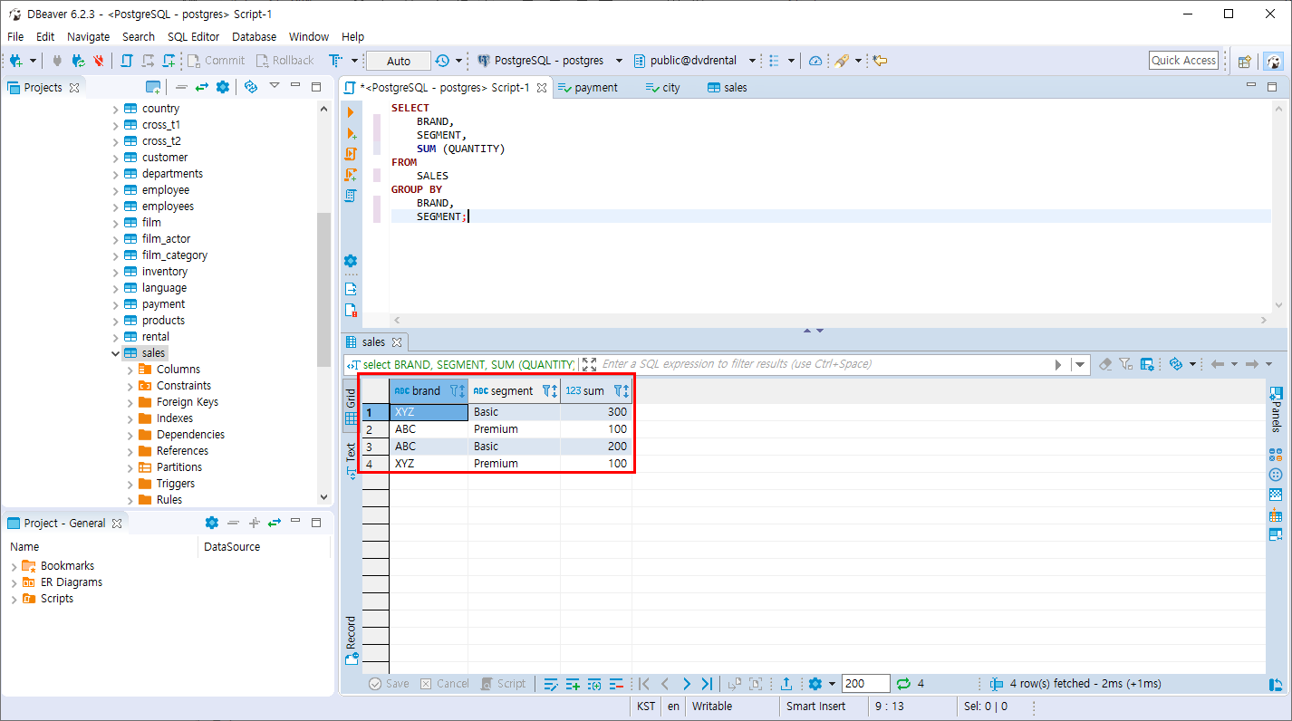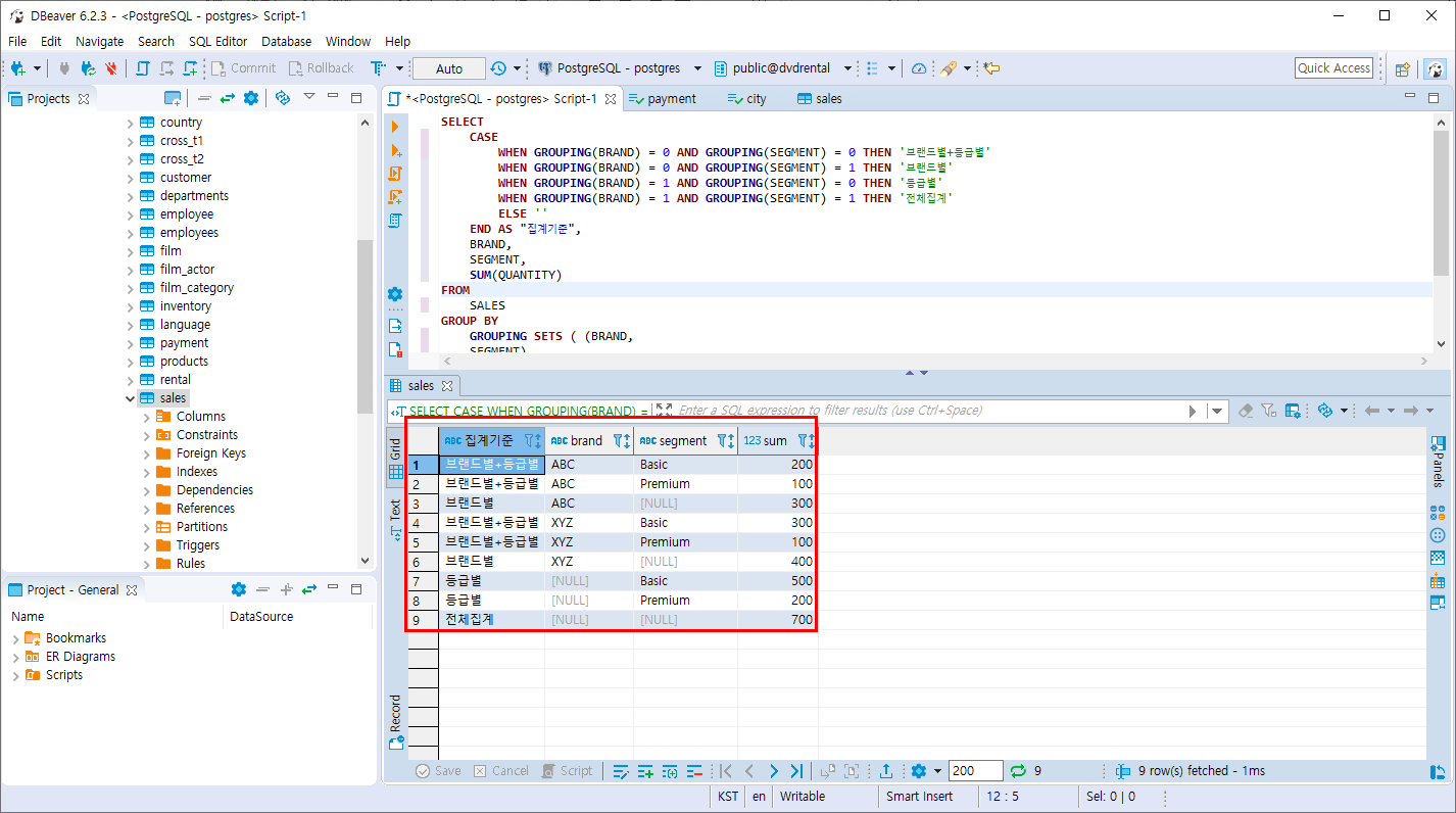 - SALES 테이블의 UNION ALL을 이용하여 BRAND,SEGMENT 기준, BRAND 기준, SEGMENT기준, 전체 기준으로 QUANTITY 합계의 값을 구합니다.