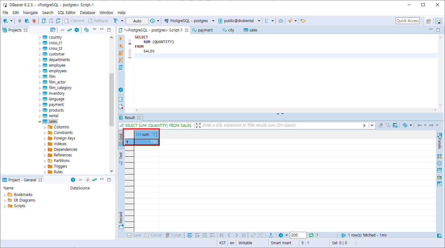 - SALES 테이블의 QUANTITY 컬럼의 합계를 조회합니다.