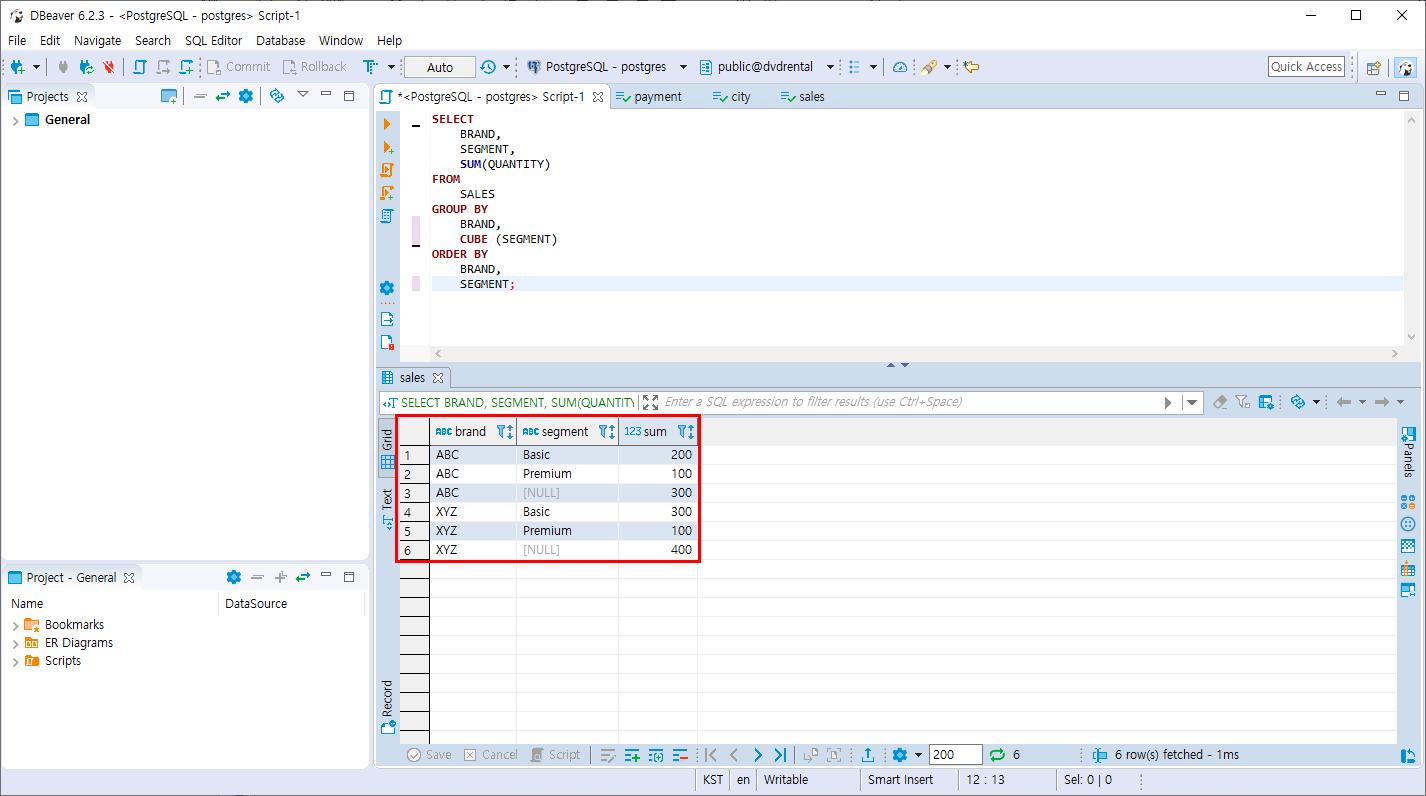 - SALES 테이블의 BRAND,SEGMENT컬럼 기준으로 CUBE 합니다.