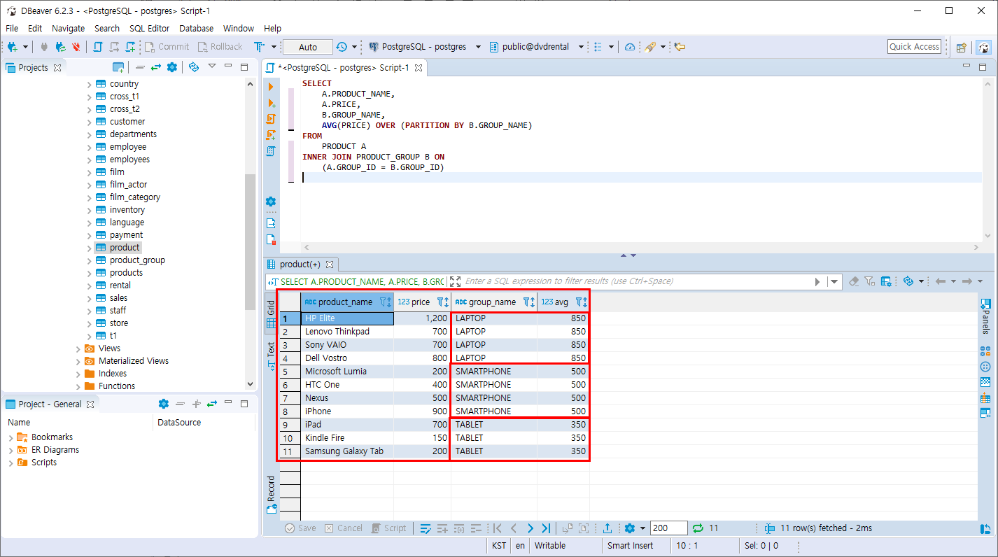 이렇듯 GROUP_NAME을 기준으로 행들의 누적값의 평균을 계산하여 조회합니다.