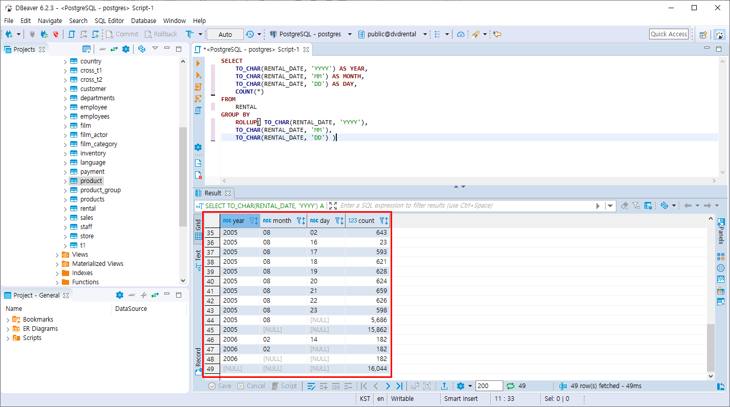 RENTAL 테이블을 이용하여 연, 연월, 연월일, 전체 각각의 기준으로 RENTAL_ID 기준 렌탈이 일어난 횟수를 출력하세요.
