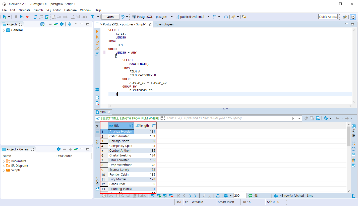 - FILM 테이블의 영화 분류별 상영시간이 가장 긴 영화의 제목 및 상영시간을 조회합니다. 상영시간이 가장 긴 상영 시간을 구합니다.