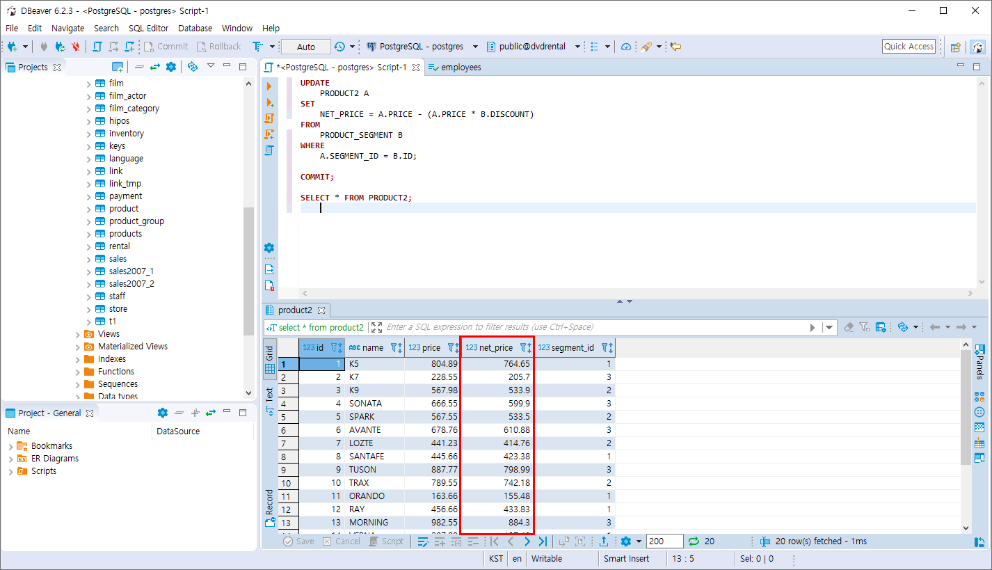 - UPDATE JOIN을 사용하여 PRODUCT_SEGMENT 테이블의 할인율 만큼 가격을 할인한 후 NET_PRICE 컬럼에 값을 저장
