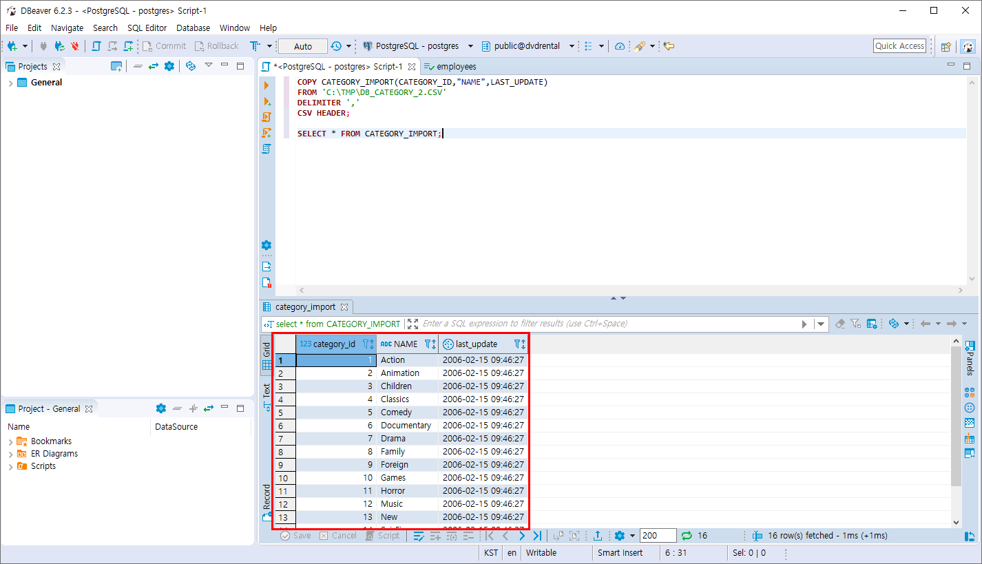- CATEGORY 테이블에서 EXPORT한 HEADER가 없는 DB_CATEGORY.csv 파일을 CATEGORY_IMPORT 테이블로 IMPORT합니다.