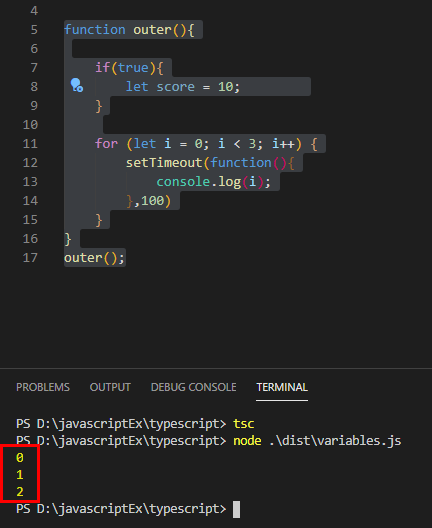 0.1초 딜레이로 0 , 1, 2의 값을 기대합니다. 그러면 tsc 컴파일 후 node js로 js파일을 실행해서 값을 확인합니다.