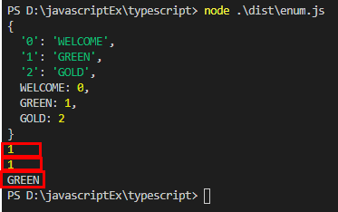 enum 타입의 등급 데이터 를 선언한다. 그리고 switch 문을 사용하여 등급별 할인률을 반환하게 되는데 WELCOME, GREEN, GOLD 의 값이 무엇인지 알 수 없다. 그래서 콘솔에 값이 어떻게 찍히는지 컴파일 후 js파일을 실행해본다.