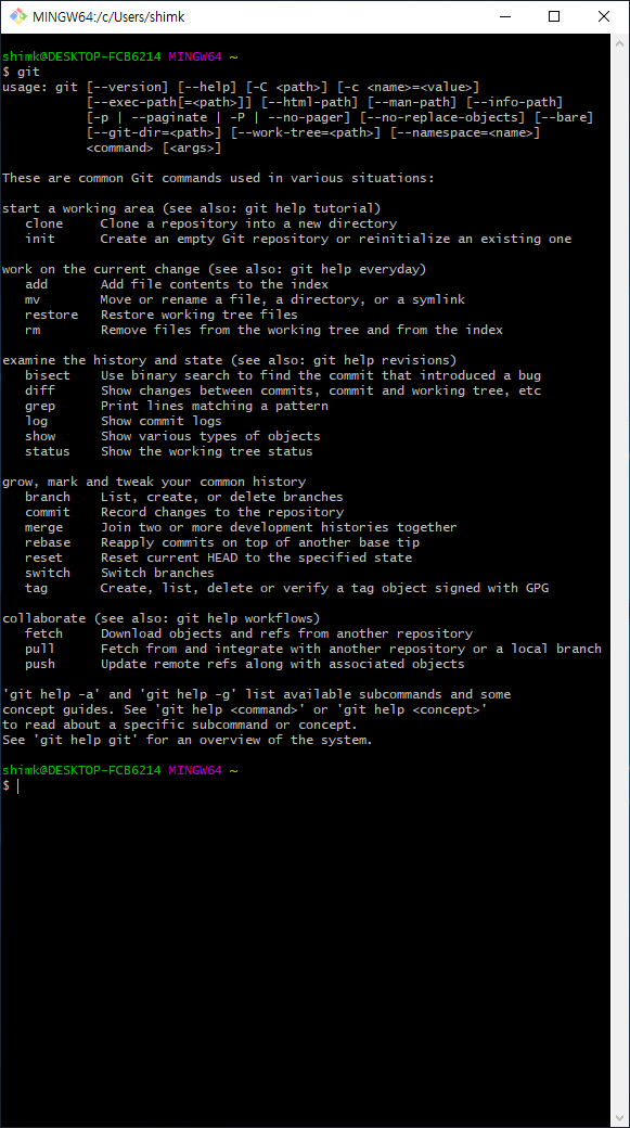 Git bash 를 이용하여 git명령어를 입력하시면 옵션값들이 나오는걸 볼 수 있습니다.