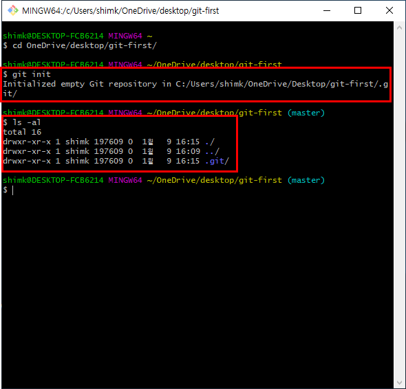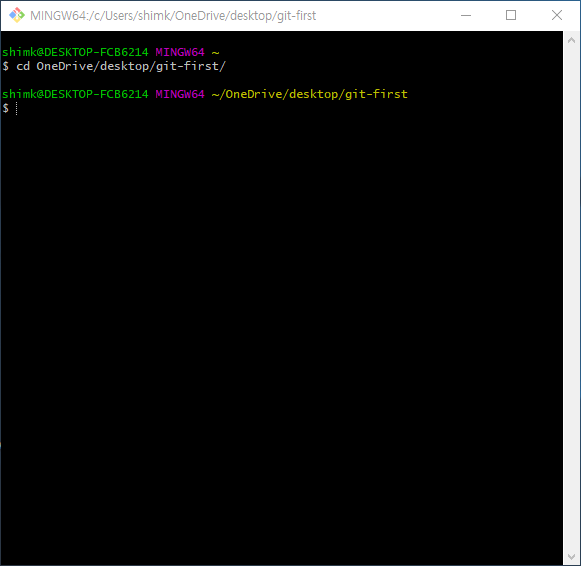 저는 윈도우 바탕화면에 git-first라는 폴더를 생성하였고 해당 폴더로 이동하였습니다.