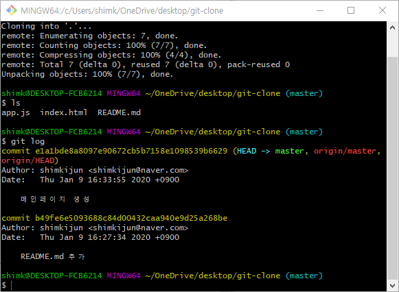 저는 git-clone 폴더를 바탕화면에 만들었습니다. Clone with HTTPS를 사용하여 내려받으면 git init 처리를 생략 할 수 있음.