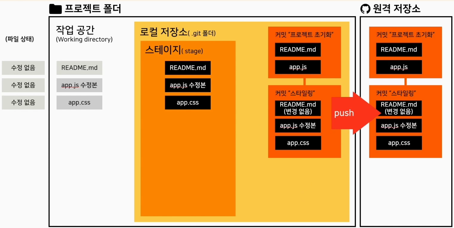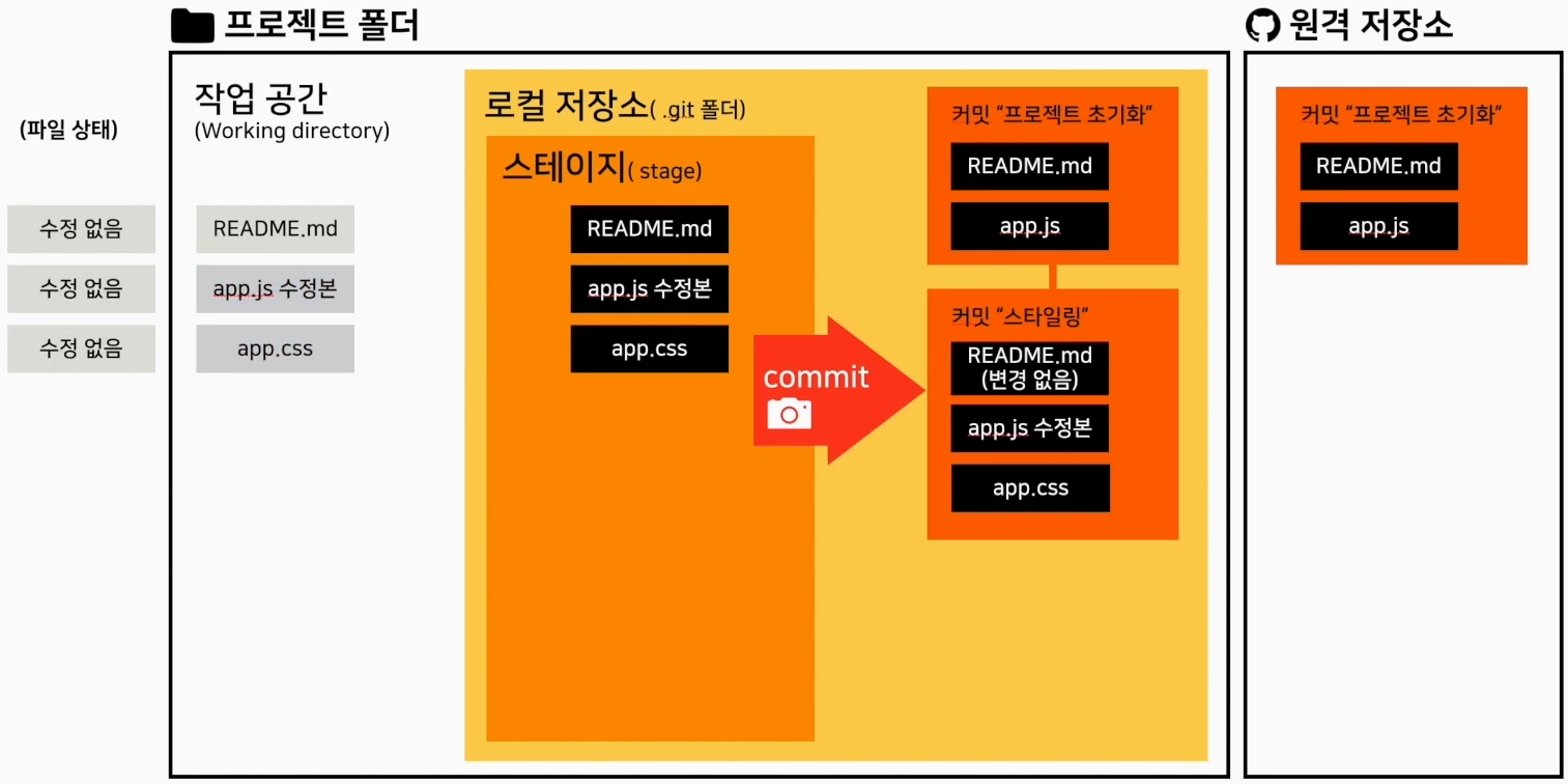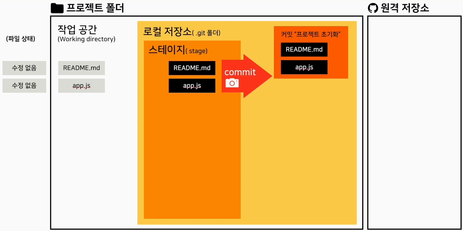 git commit은 stage에 올라온 모든파일을 저장한다 그럼 상태는 수정 없음으로 변하고 다시 수정 가능하게 변경