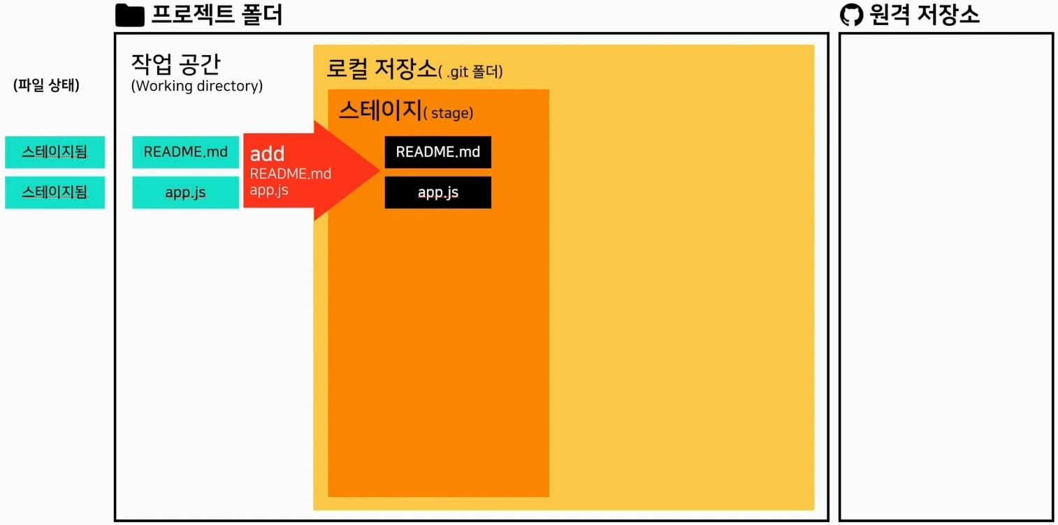 추가,수정 된 파일을 또 add 하게 되면 stage에는 2개만 올라가지만 README.md파일은 수정없음 상태로 항상 올라가 있게 됩니다.