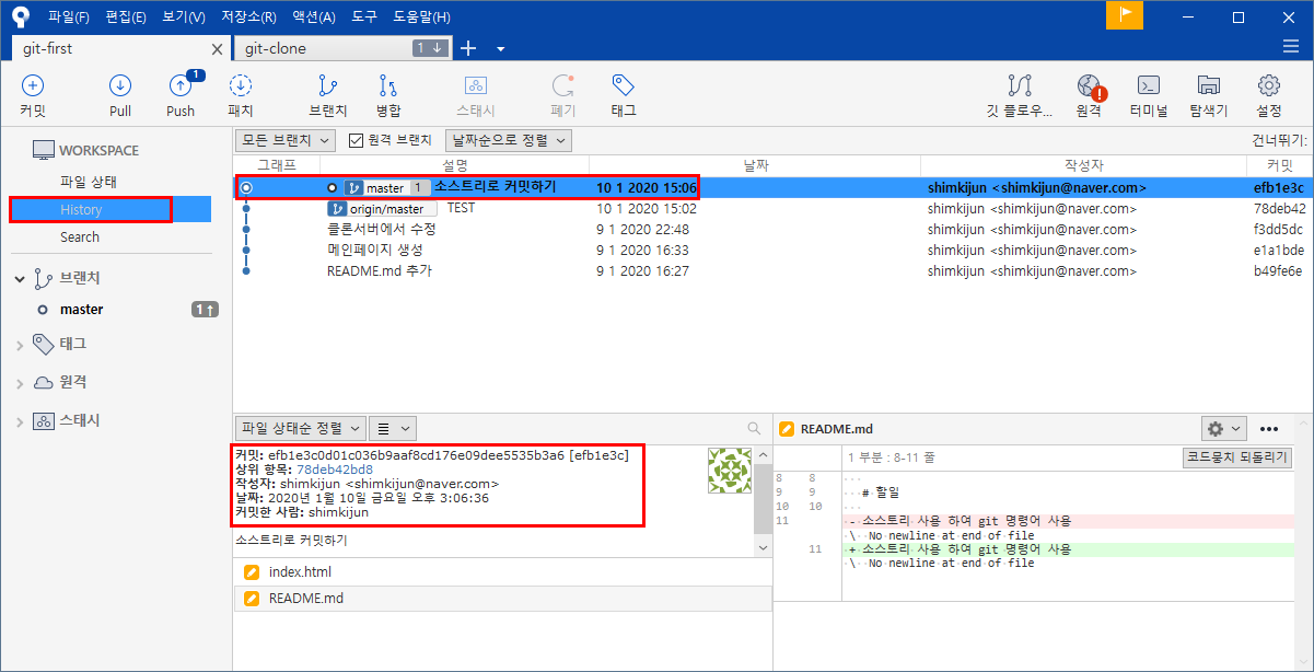 History에 각 라인마다 커밋 로그정보가 보여짐. master와 origin/master 가 보이는데 master는 내 컴퓨터에만 있는것,