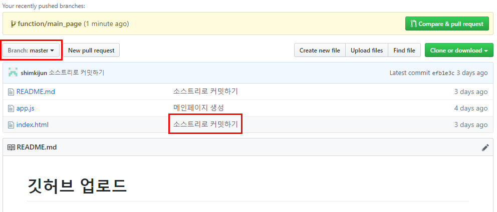 master 브랜치는 main_page 가 올린 커밋 이 적용되지 않은걸 볼 수 있습니다.