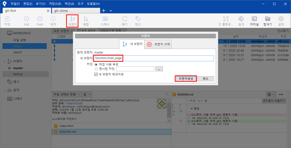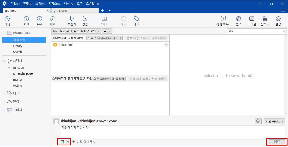 git-first 에는 메인 페이지 기능을 개발하는 function/main_page의 브랜치를 생성