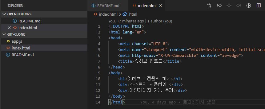 그럼 vs code의 소스는 main_page 가 push 한 코드가 보여집니다. 반대로 main_comment를 선택하면 댓글 기능을 push 한 소스로 변경됩니다.