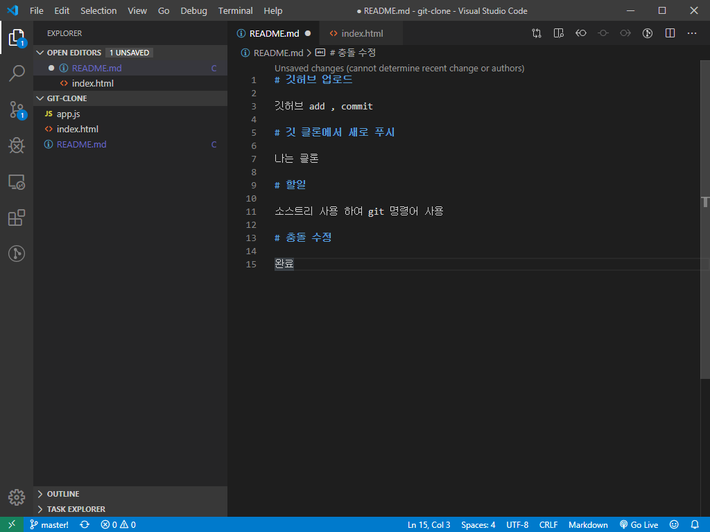 충돌이 나면서 vs code README.md 파일에 어떤 내용이 맞는지 선택하라고 보여줍니다. 이 내용을 수동으로 수정해서 다시 push를 합니다.