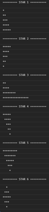 console.log(' '.repeat(Math.abs((1-(star+1)))/2) + '*'.repeat(5-Math.abs(star)));